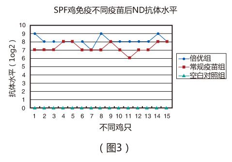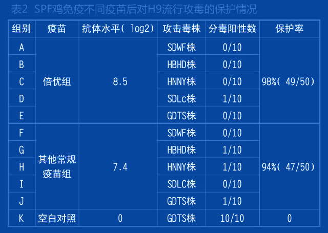 在實驗室條件下,SPF雞7日齡一次免疫倍優(yōu)TM系列產品(ND+H9 ) 0.1ml,免疫后21天采用各地分離的流行H9毒株行攻毒,倍優(yōu)組的攻毒保 護為98% (表2)。