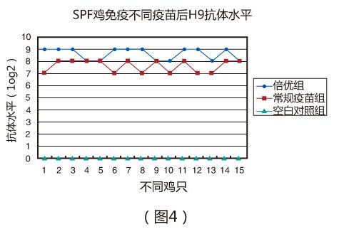 (一)在實驗室條件下,SPF雞7日齡一次免疫倍優(yōu)?系列產品(ND + H9 ) 0.1ml ,免疫后21天,倍優(yōu)組ND和H9抗 體分別達到8.1log2 (圖3 )和8.6log2 (圖4 );常規(guī)疫苗組ND和H9抗體分別僅為7.3log2 (圖3 )和7.6log2 (圖4)。