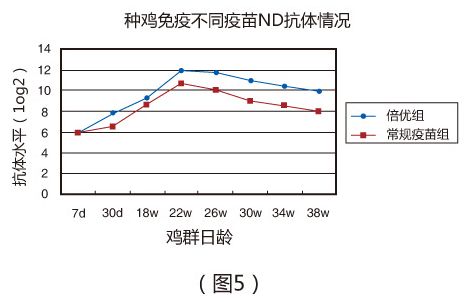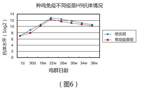 (二)在現場條件下,種雞分別與7日、30日和18周分別免疫倍優(yōu)TM系列產品(ND+H9),劑量分別為0.1ml、 0.3m和0.3ml。于22周,倍優(yōu)組ND和H9抗體分別達到12log2 (圖5 )和12.2log2 (圖6 ),且維持時間明顯優(yōu)于常規(guī)疫苗組;常規(guī)疫苗組ND和H9抗體分別僅為10.7log2 (圖5 )和11.8log2(圖6 )。