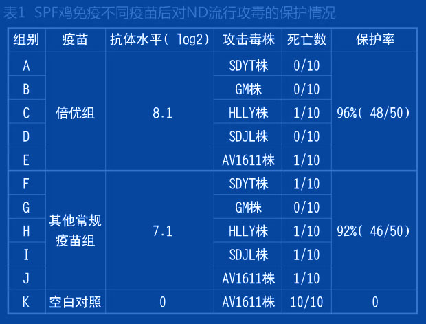 在實驗室條件下,SPF雞7日齡一次免疫倍優(yōu)系列產品(ND+H9 ) 0.1ml ,免疫后21天采用各地分離的流行ND毒株(基因VII型)進行攻毒, 倍優(yōu)組的攻毒保護為96%(表1)。