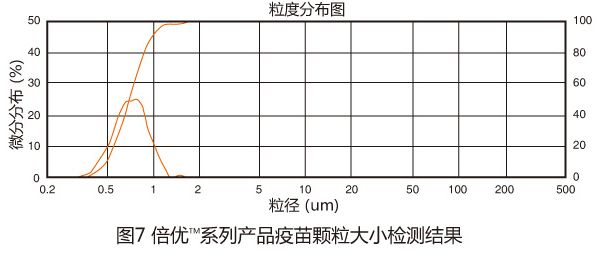 倍優(yōu)?系列產品每一個疫苗毒株均單獨接種雞胚,分別采毒后經超高超微分離濃縮后再純化,高度去除雞胚尿棄液中的尿酸鹽、脂多糖等雜質,經過高度純化和超高濃縮后,在進行抗體復配,確保抗原成分單一,從而保證乳化后的疫苗顆粒大小適中、均勻,有效刺激機體產生高而待久的抗體水平;倍優(yōu)?系列產品疫苗顆粒大小0.5~0.6μm ,該大小顆粒占95%以上(圖7)。