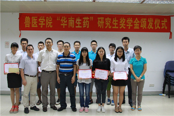 2015年6月24日下午3:30,“華南生藥”研究生獎學金頒獎暨揭牌儀式在農業部畜禽產品質量監督檢驗測試中心101報告廳舉行。廣州市華南農大生物藥品有限公司梁昭平總經理、營銷中心黃國城副總經理、公司技術部李敏經理、行政拓展部許芬芬經理、我校獸醫學院黨委書記梁梓森、黨委副書記楊利江、輔導員陳曉梅老師、全體獲獎學生和學生代表出席并參加了掛牌儀式和頒獎典禮。