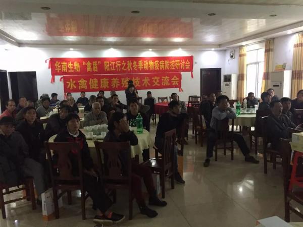 2017年11月20日和21日由廣州市華南農大生物藥品有限公司主辦的水禽健康養殖技術交流會在美麗的濱海旅游城市陽江市勝利舉辦。陽江市是廣東省四大優良鵝種之一--陽江鵝的主產地,因此養殖戶對于當前水禽主要流行疫病關注度比較高,參會熱情高漲,參會人員共100余人,會議成果遠超預期,圓滿結束。