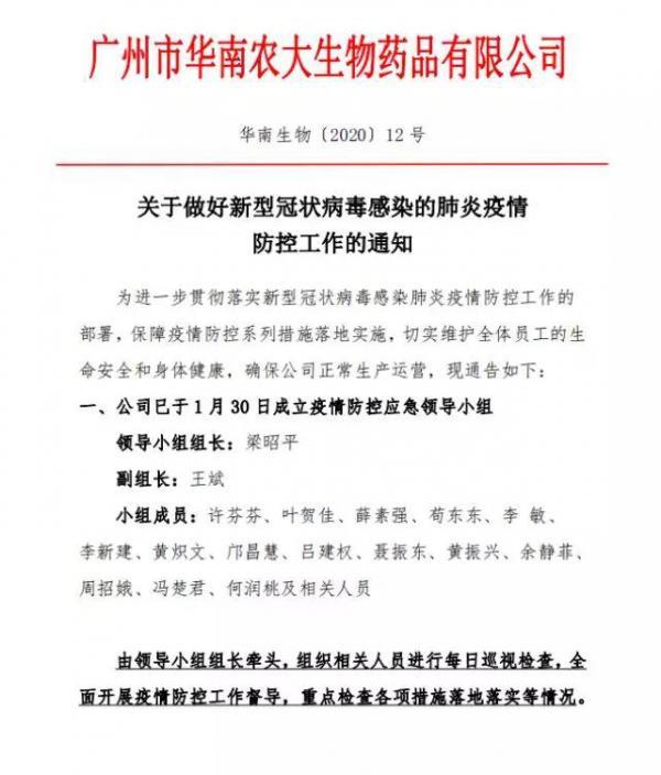 為了抗擊疫情,做好全面防范工作,公司積極響應國家號召,緊急發布落實做好新型冠狀病毒感染的肺炎疫情防控工作的通知。第一時間組成由梁昭平總經理領導下的“華南生物疫情防控應急領導小組”及各個專項小組,全方位指導員工投入有序的防控工作當中,切實做好重大疫情疫病的防控工作。