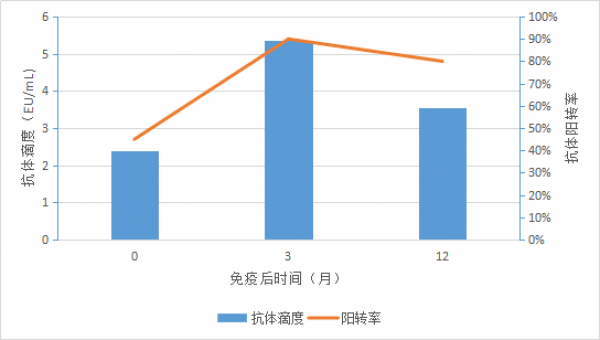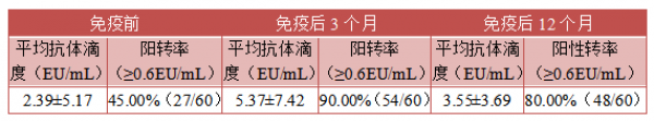 免疫前0天、免疫后3個月和6個月隨機采集免疫犬的血液,分離血清,以ELISA方法測定犬的狂犬病抗體。結果顯示,免疫前僅有27頭犬的抗體滴度達到或超過0.6 EU/mL,抗體陽轉率僅為45.00%,平均抗體滴度2.39EU/mL。免疫3個月后,抗體陽轉的犬達到54頭,抗體陽轉率提高到90.00%,平均抗體滴度為5.37EU/mL。免疫12個月后,抗體陽轉的犬仍有48頭,抗體陽轉率維持在80.00%,平均抗體滴度為3.55EU/mL(表1、表2和圖1)。