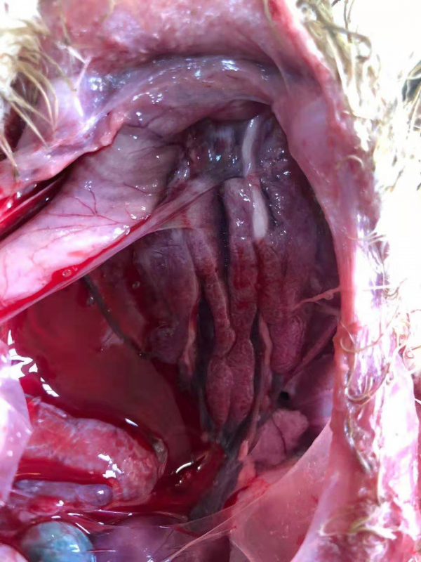 剖檢可見全身皮下清晰可見尿酸鹽沉積,附關節紅腫且關節腔內有尿酸鹽沉積,腎臟腫大,呈花斑狀,表面有尿酸鹽沉積,輸尿管高度擴張,管腔內充滿石灰樣沉積物,其他內臟器官(心、肝、脾、腸系膜、腹膜)的表面有白色尿酸鹽沉積,嚴重時形成一層白色的薄膜,肌胃角質層易剝離,顏色發黑并伴有潰瘍,腺胃腫脹,表面有白色物質附著。少量有大腸桿菌及漿膜炎等細菌感染的病理變化。