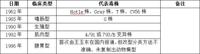 雞傳染性支氣管炎是一種廣泛存在的對(duì)家禽業(yè)造成巨大經(jīng)濟(jì)影響的家禽疾病。不斷出現(xiàn)的新的IBV基因型及不同基因型之間缺少交叉保護(hù)已經(jīng)成為防控IBV的重要挑戰(zhàn)。IBV致病型(臨床型)與IBV毒株血清型/基因型之間并無(wú)必然的聯(lián)系,不同血清型或基因型毒株可能屬于相同致病型。同時(shí),屬于同一血清型或基因型的IBV毒株可能屬于不同致病型。現(xiàn)就雞傳染性支氣管炎病毒臨床分型和代表毒株說(shuō)明如下: