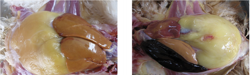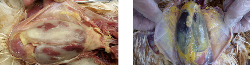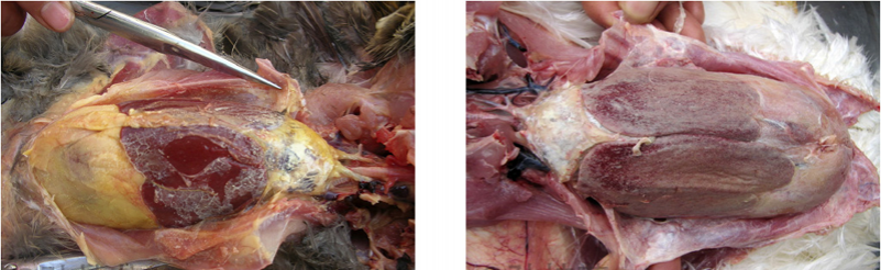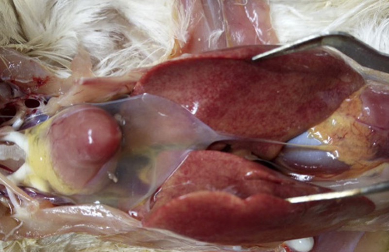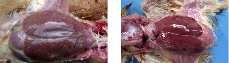 1、雞大腸桿菌?。焊闻K、心臟的周圍形成一層灰白色或灰黃色纖維素性包膜,又稱作包心、包肝。