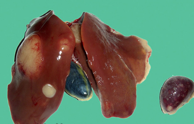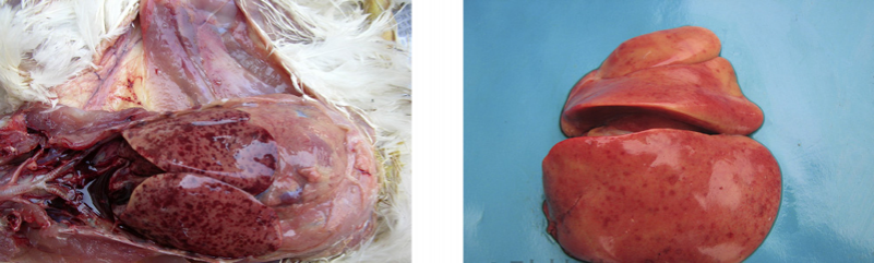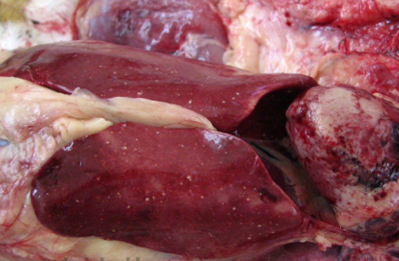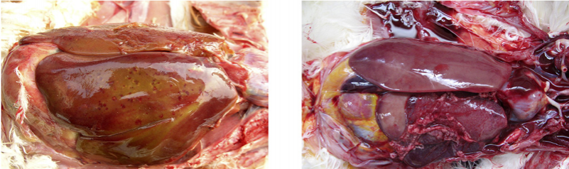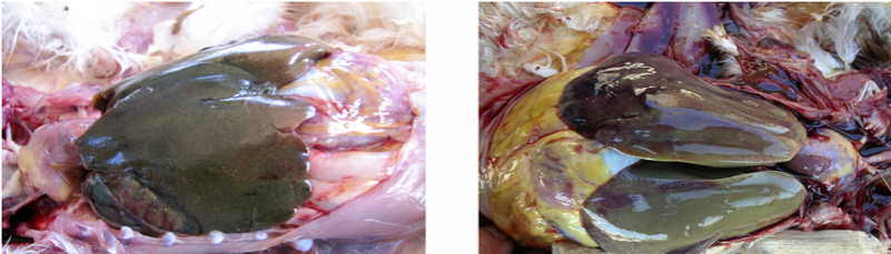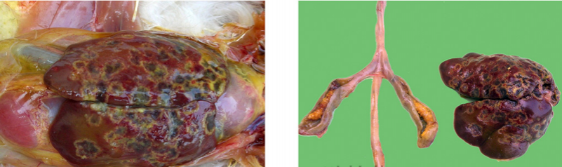 3、禽傷寒:肝臟變成淡綠棕色或古銅綠色,肝臟表面有時(shí)有灰白色米粒狀壞死點(diǎn)。