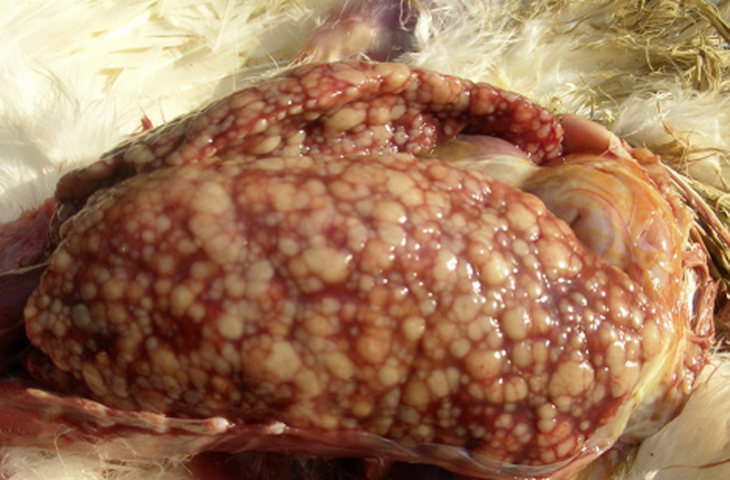 2、雞白?。旱湫偷牟∽?yōu)楦文[大表面可見多量點(diǎn)狀出血或灰白色針尖狀及小米粒樣壞死灶或灰白色增生性結(jié)節(jié)。