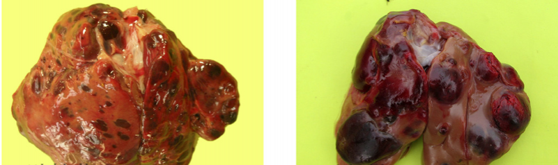 7、禽淋巴細(xì)胞白血病:肝臟異常腫大,可覆蓋整個(gè)腹腔,表面彌漫性腫瘤病灶,腫瘤表面灰白色且光滑、切面灰白色。