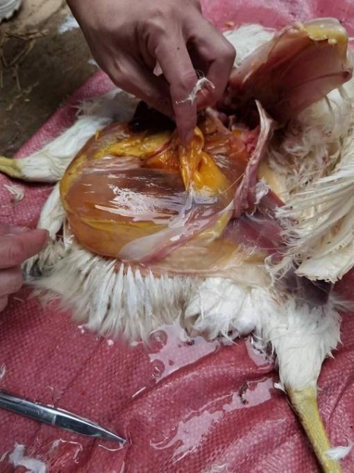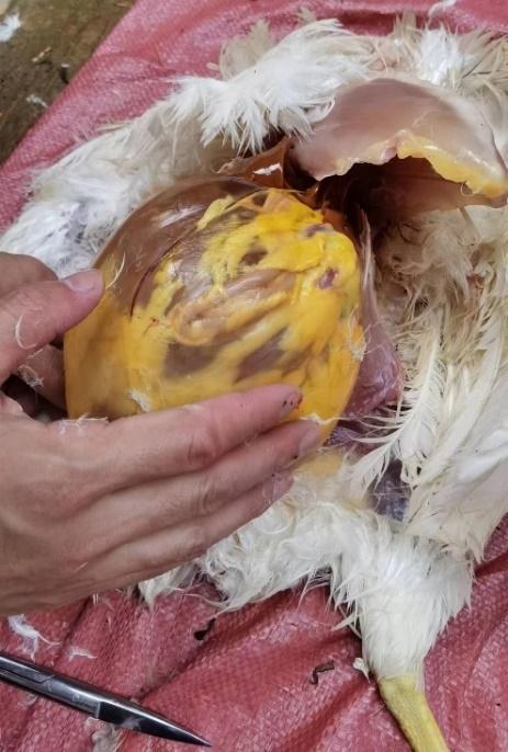 茂名某規(guī)模化蛋雞場飼養(yǎng)蛋雞3棟,單棟1.5萬只。A棟雞從開產(chǎn)到230日齡產(chǎn)蛋率一直上不去,維持在85%左右。大群采食量和飲水正常,平均每只雞采食量為105g,大群精神狀況良好,糞便正常。臨床觀察發(fā)現(xiàn)個(gè)別雞只(30只左右)腹部膨大下垂,觸之有波動(dòng)感。頭頸高舉,行走時(shí)呈企鵝狀姿勢。B棟和C棟無此情況。